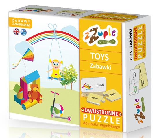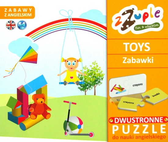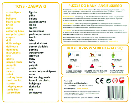 Puzzle obrazkowe - dopasowując 27 obrazków do ich angielskich znaczeń, dziecko w szybki sposób opanuje słownictwo; pomocne w nauce będą słowne tłumaczenia w języku polskim i angielskim na odwrocie puzzli oraz słowniczek umieszczony z tyłu opakowania