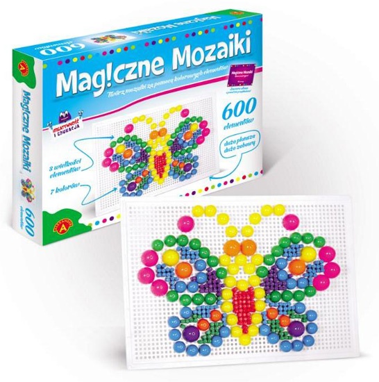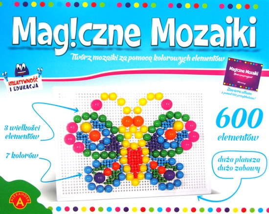 "Magiczne mozaiki" to kreatywna zabawka edukacyjna dla dzieci, młodzieży i dorosłych. Do waszej dyspozycji oddana zostaje plansza z mnóstwem otworów, w których należy umieścić różnej wielkości kolorowe elementy, by stworzyć rozmaite wzory i obrazy. W każdym pudełku znajduje się album z ponad 100 przykładowymi wzorami.