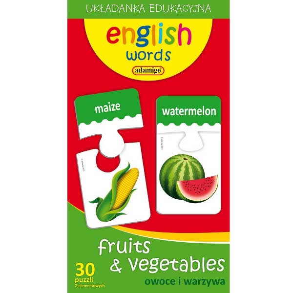 Opis produktu: Celem zestawu jest nauka angielskich słówek poprzez zabawę. Podczas układania puzzli dziecko w naturalny sposób utrwala graficzny zapis wyrazu angielskiego. Wskazana jest pomoc osoby dorosłej w odczytywaniu wyrazów, tak, aby dziecko równocześnie kodowało wymowę z wyrazem. Dzieciom rozdaje się losowo mniejsze części puzzli z napisem angielskim, każdemu taką samą ilość. Pozostałe części układa się na stole obrazkami w dół. Dzieci kolejno sięgają po jeden element i starają się dopasować go do swoich kartoników. Ten z graczy, który najszybciej skompletuje swój zestaw, wygrywa. Zawartość pudełka: 60 elementów (30 puzzli 2 elementowych). Gra przeznaczona: dla 1 do 6 graczy w wieku od 5 lat.