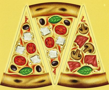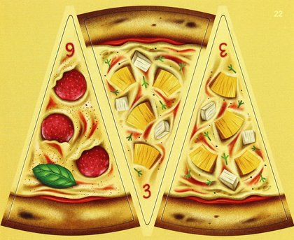 Następnie każdy z was wybiera swoją porcję. Starajcie się zebrać jak najwięcej takich kawałków, na jakich wam zależy. Jeśli będziecie mieć ich więcej niż rywale, zdobędziecie punkty! Dodatkowe punkty otrzymacie za listki bazylii na zjedzonych przez siebie kawałkach pizzy. Wygra osoba z największą liczbą punktów.