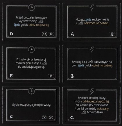 Wybieracie się z przyjaciółmi do pizzerii. Co rundę inna osoba dzieli pizzę na kilka porcji. Pizza składa się z kawałków różnego rodzaju. Niektórzy mają ochotę na pepperoni, inni na wiejską albo wegetariańską. Gracz musi podzielić pizzę w przemyślany sposób - porcje nie muszą być równe!
