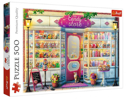 Puzzle składające się z 500 elementów przedstawiające sklepik ze smakowitymi słodyczami. Po ułożeniu powstanie obrazek o wymiarach 580 x 340 mm. Produkt został wykonany z wysokiej jakości materiałów, z zastosowaniem specjalnego kalandrowanego papieru odbijającego światło, co ułatwia układanie. Produkt został wyprodukowany w Polsce, a do produkcji zostały użyte materiały ekologiczne.